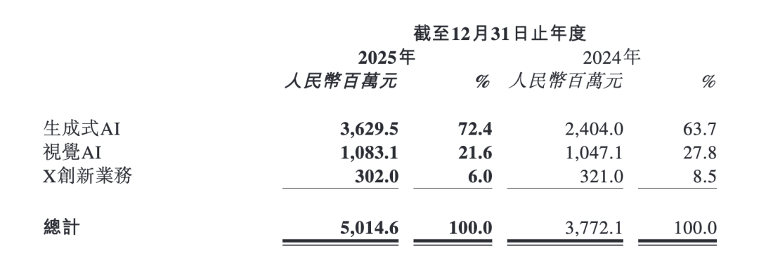 业务占比方面,2025年,商汤科技生成式AI收入为36.3亿元,同比增长51%,占比达72.4%;视觉AI收入10.8亿元,占比为21.6%;X创新业务营收3.02亿元,占比6%。