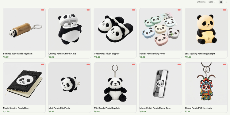 你先分析美国市场有哪些流行的熊猫周边,从中筛选适合电商新人起步的低价商品,再选20件你认为可能最好卖的,帮我上架到店铺,同时将店铺装修匹配熊猫主题的卡通风格。