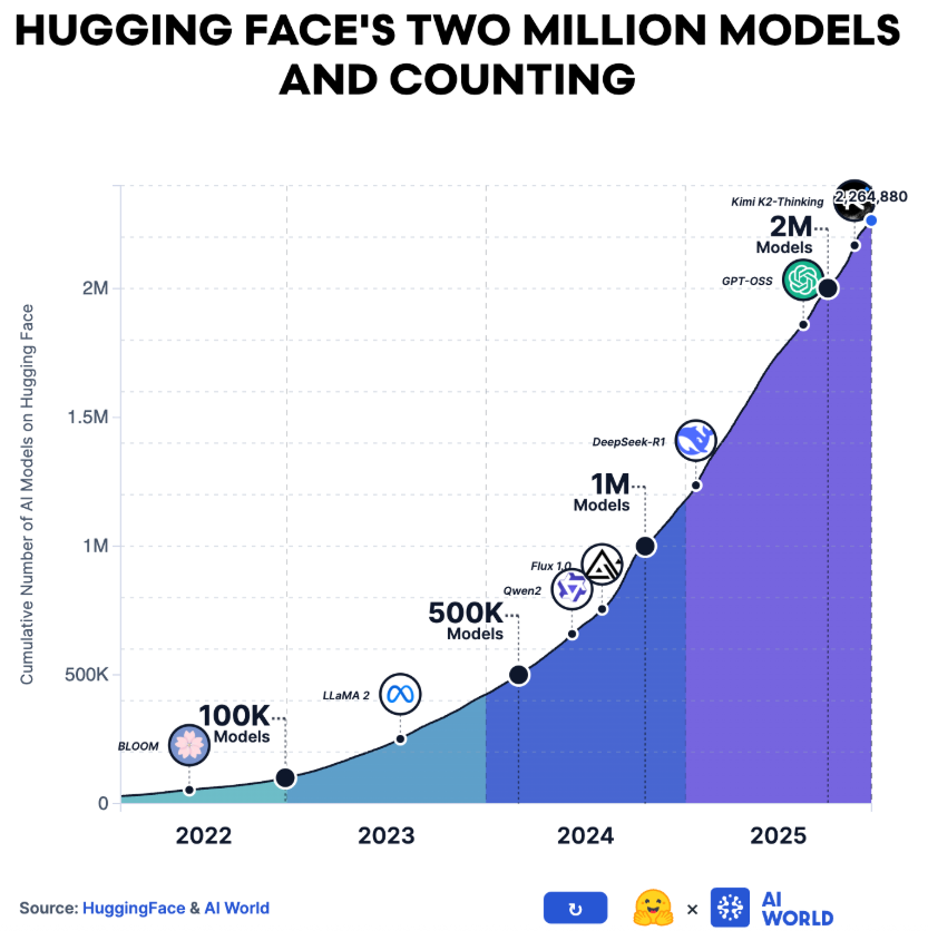 Hugging Face平台用户数攀升至1300万,公开模型突破200万个,数据集超过50万个,这些数字较上一年几乎翻了一番。
