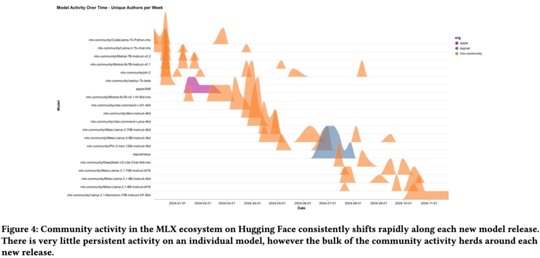 用户对开源模型的参与通常在发布后迅速达到峰值,然后放缓。平均参与持续时间约6周。持续改进和频繁更新对保持相关性至关重要。