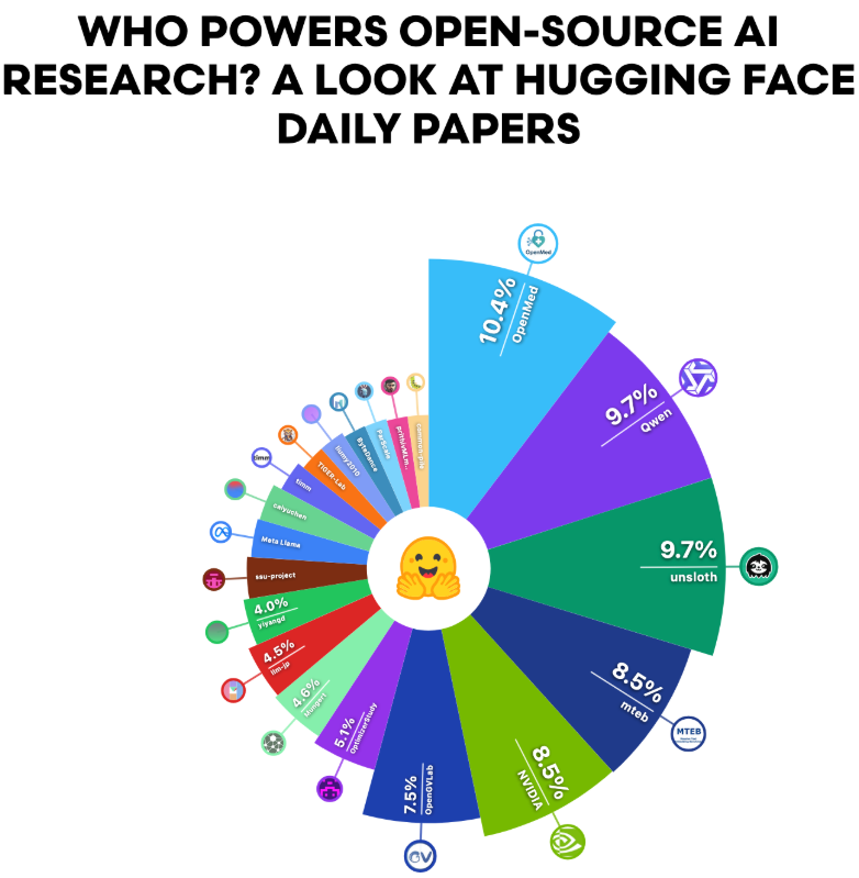 论文和科学贡献方面,Hugging Face Daily Papers数据显示,大型AI组织的论文受到社区成员广泛认可。