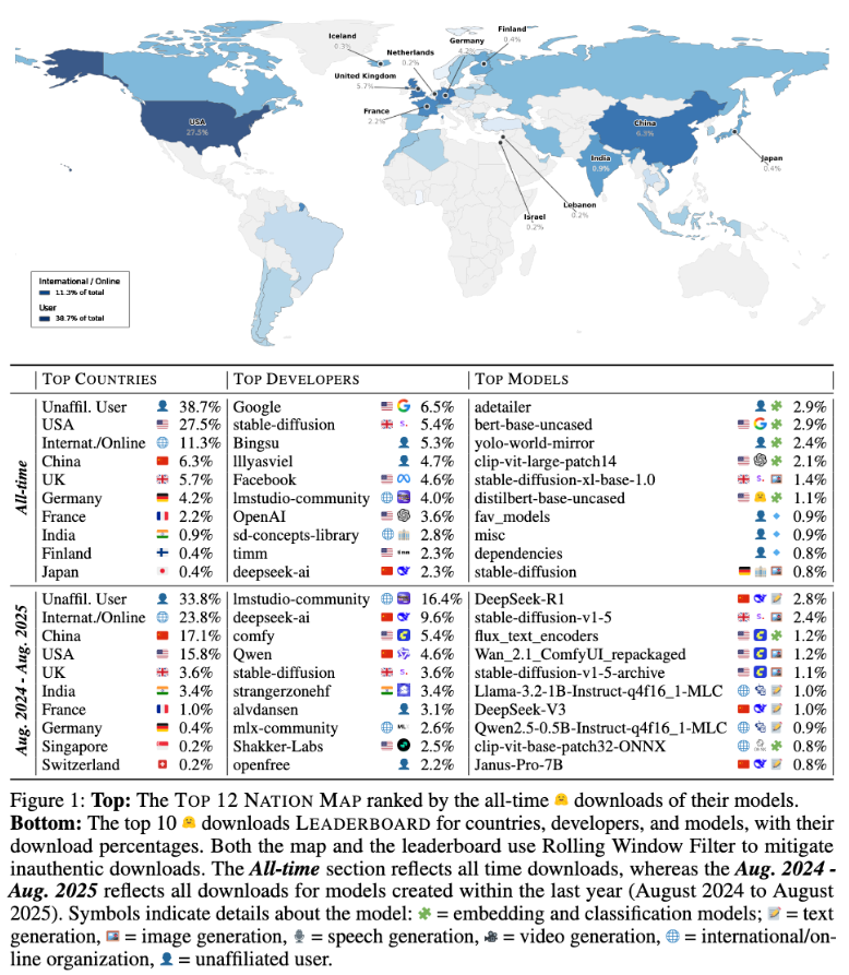 模型开发者如果是个人用户或分布式组织,没有明确地理归属,约占平台总下载量的一半。