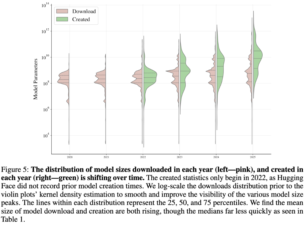 下载模型的大小也在变化。2023年下载模型平均参数量为8.27亿,2025年升至208亿,主要由量化和混合专家架构推动。