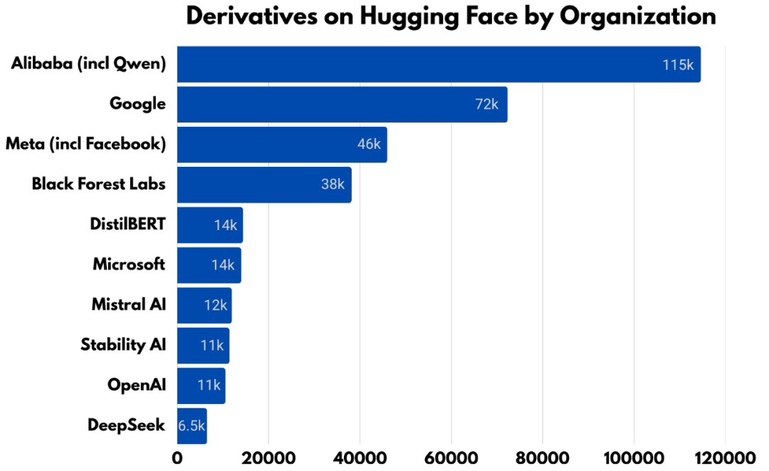 阿里巴巴作为组织,其衍生模型数量超过谷歌和Meta的总和,Qwen家族构成超过113000个衍生模型。计入所有标注Qwen的模型,数字膨胀到超过200000个。