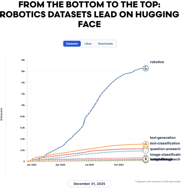 数字令人瞩目,机器人数据集从2024年的1145个增长到2025年的26991个,三年内从第44位攀升至数据集类别的第一名。