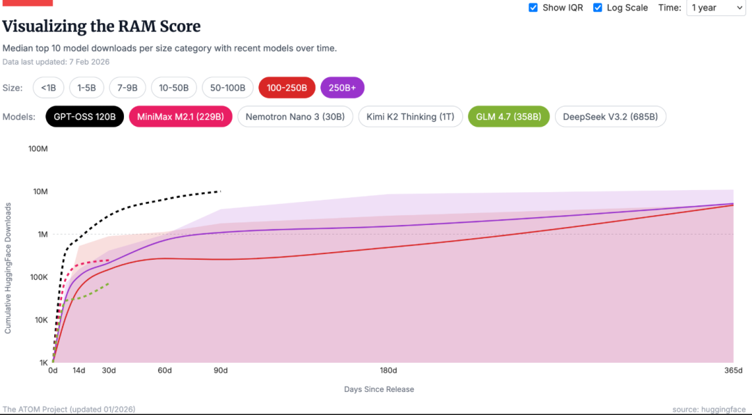 小模型主导部分原因在于发布数量更多,但即使归一化处理,ATOM项目的相对采用指标显示,1至90亿参数的中位数前10模型下载量仅比1000亿以上参数的模型高约4倍。