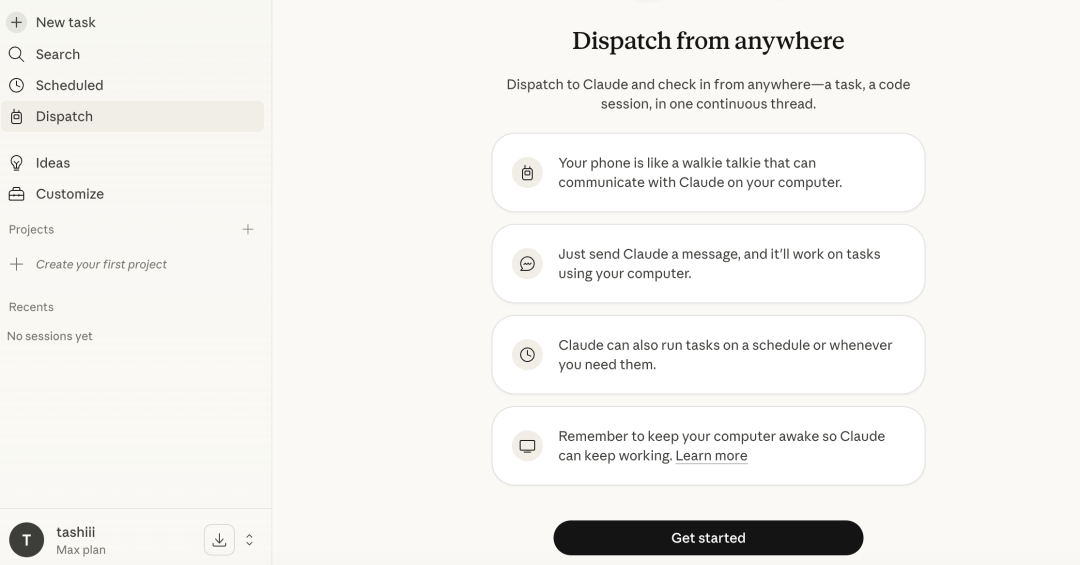这时候,回到你的手机,打开你的Claude,在里面侧边栏点进Dispatch,就会看到这样的页面。。