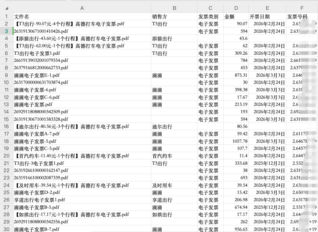 作为内容从业者,我们同事要大量出差、跑采访,一个月下来,打车、吃饭、高铁、住宿的发票能攒几十甚至上百张,PDF、图片格式混着来,高铁票和普通发票格式完全不一样,要挨个打开、录信息、做表格、核对金额,光是整理完就要花大半天,一个小数点错了就要被财务打回返工。