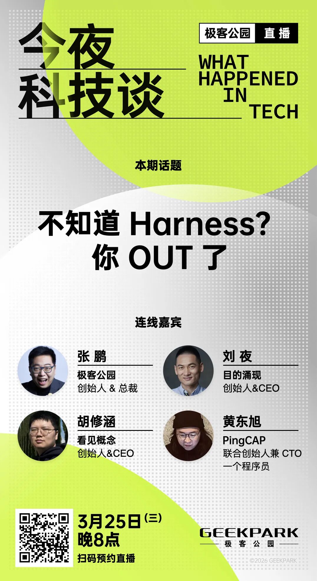 今晚 20:00,极客公园视频号直播间,一起深度探讨:OpenClaw 实战痛点、Harness 工程价值、组织与人才变革、AI 创业双路线,以及拆解 Agent 接下来的结构性变化。