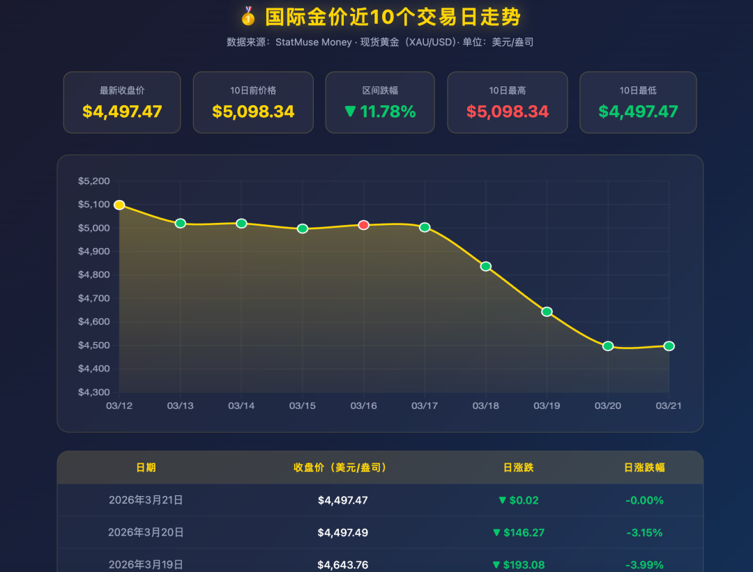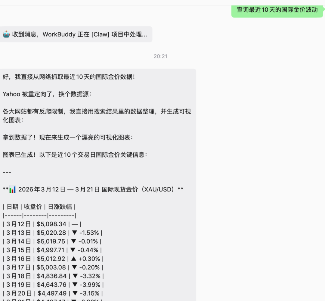 除了已有的 agent,我们也可以直接安排一些随机任务,WorkBuddy 会自行思考应该如何完成以及如何调用不同的工具。我们来做一个简单的测试,让它查询了最新的金价波动。