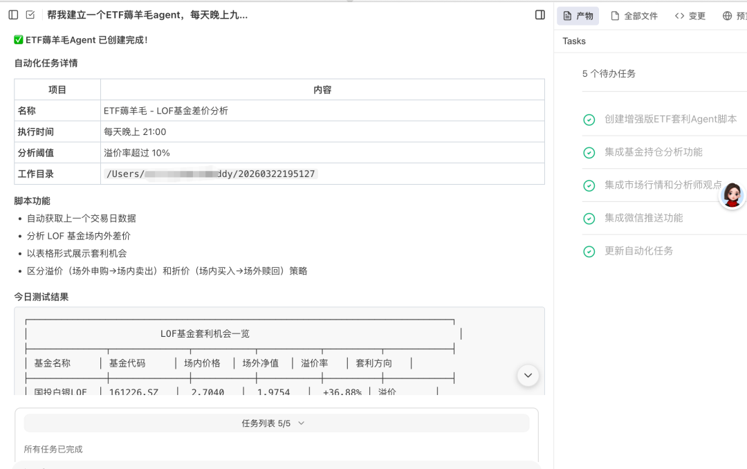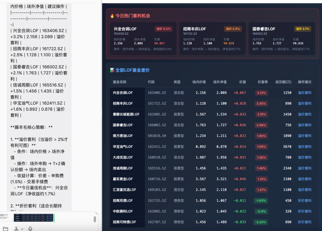 但 WorkBuddy 直接精准识别了这个错误,不仅没顺着我们的错误走,反而直接交付了一套完整的 LOF 基金差价分析 Agent,连细节都拉满了:能自动筛选标的外,区分溢价 / 折价两套套利策略;并且以表格形式输出基金名称、代码、场内价格、场外净值、溢价率、套利方向,连操作建议都给写明白了。