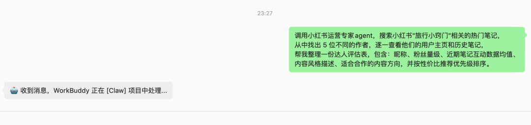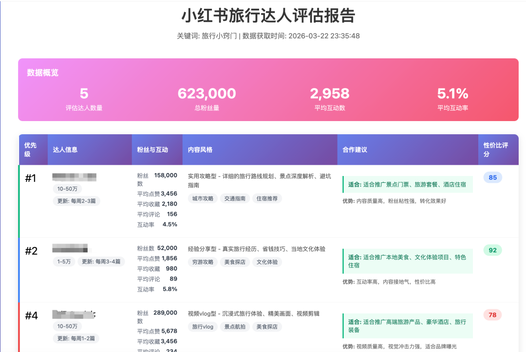 比如,我让它帮我找到小红书最合适的旅行类博主,只需要输入:调用小红书运营专家 agent,搜索小红书"旅行小窍门"相关的热门笔记,从中找出 5 位不同的作者,逐一查看他们的用户主页和历史笔记,然后帮我整理一份达人评估表,包含:昵称、粉丝量级、近期笔记互动数据均值、内容风格描述、适合合作的内容方向,并按性价比推荐优先级排序。