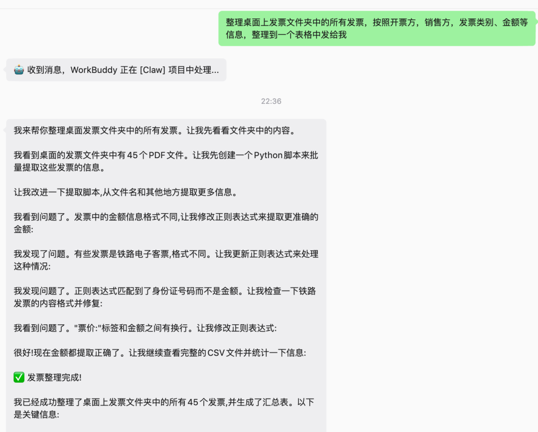 我们直接甩给它一个装了 45 张各类发票的文件夹,提了一句:整理桌面上发票文件夹中的所有发票,按照开票方、销售方、发票类别、金额等信息,整理到一个表格中发给我。