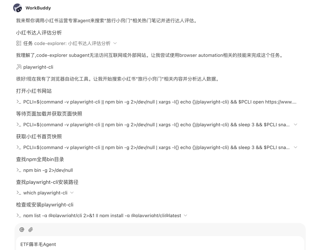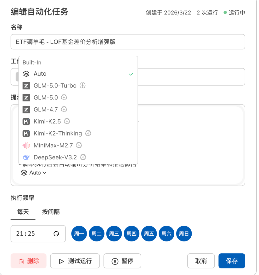 甚至,在创建 agent 或者自动任务的时候,模型会自动分析完成任务需要哪些 skills,然后自动调用金融数据技能、安装所需工具,不用手动配置任何环境。