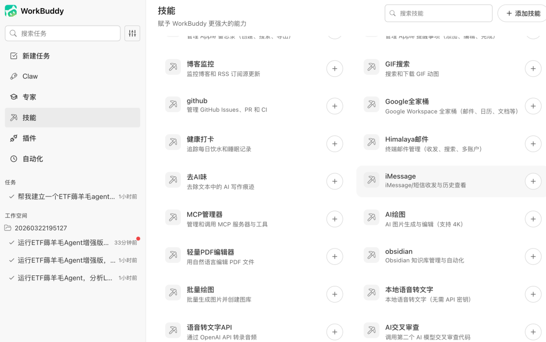 整个过程,比较惊喜的一点是相比原版 OpenClaw 需要自己写大量配置 skills 文件,WorkBuddy 直接把常用的 skills 放进了广场里,只要点一下,就能自动配置好了。