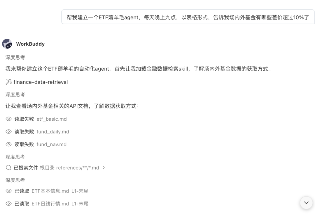 于是我们给它提了需求:「帮我建立一个 ETF 薅羊毛 agent,每天晚上九点,以表格形式,告诉我场内外基金有哪些差价超过 10% 了」。