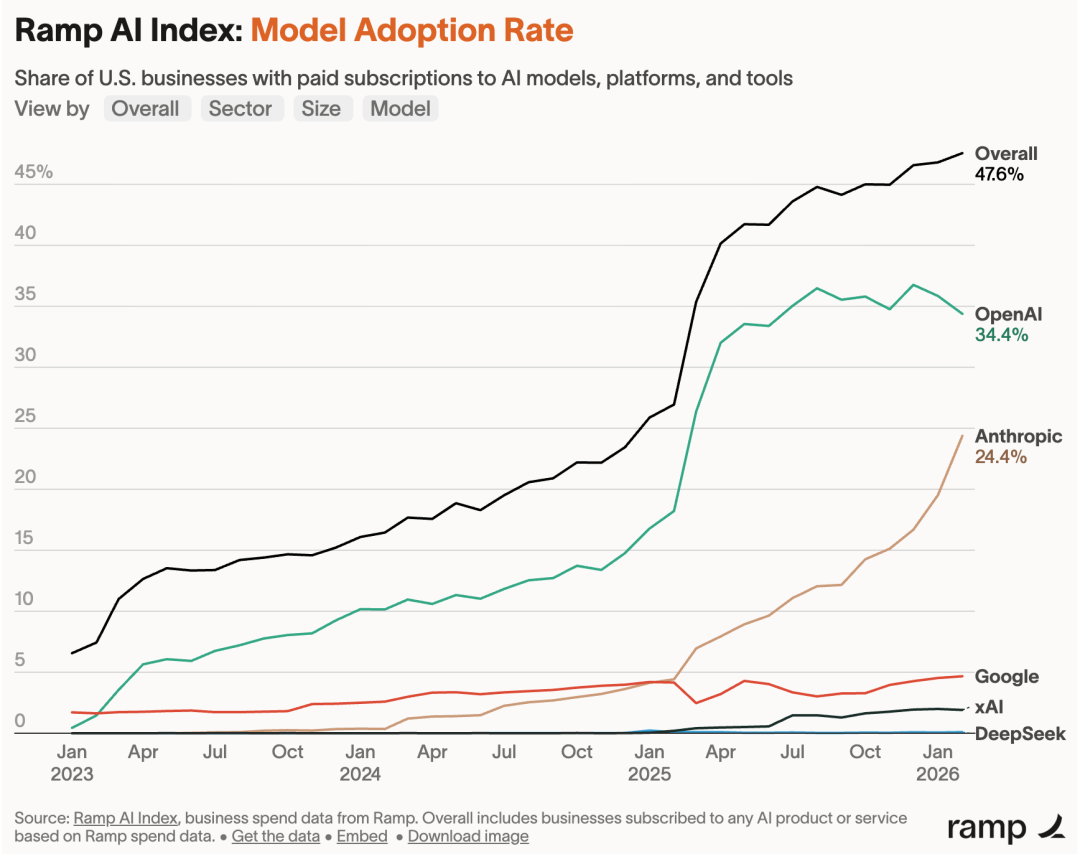 Ramp经济学家Ara Kharazian指出,一年前只有二十五分之一的企业为Anthropic付费,现在这个比例是四分之一。