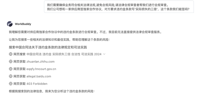 内容质量其实不低,民法典第 585 条、130%的司法实践标准,信息都是准确的。但这些是可以直接搜到的公开信息,没有针对用户具体情境做任何定制化处理。