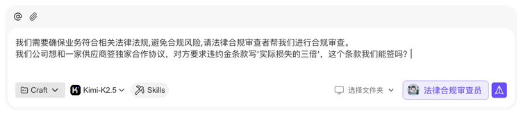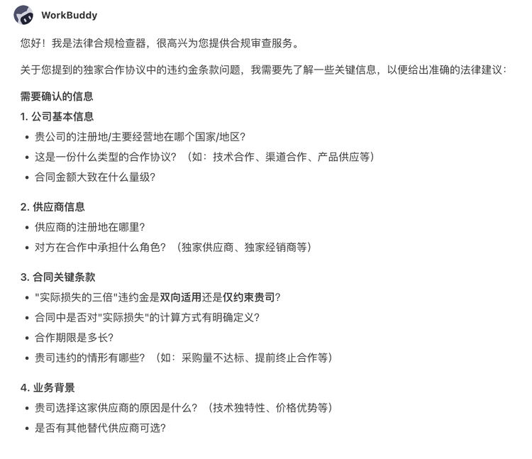 法律专家,第一步不是给答案,而是问信息。注册地、合同类型、金额量级、条款是否双向适用,这些问题本身就说明专家角色理解「同一个条款在不同情境下结论可能完全不同」。这是律师接案的标准动作。