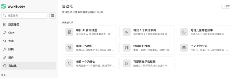 WorkBuddy 在这点上做了优化,你定时是几点,它就能几点执行。其内置了一些常见模板,如每日 AI 新闻推送、每日 5 个英语单词速记。