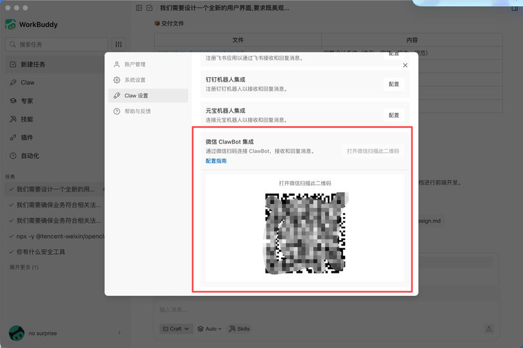 打开 WorkBuddy,找到微信直连入口,扫码。整个过程不需要安装任何插件,不需要配置 API,也不用输入命令,手机扫完就绑定完成。