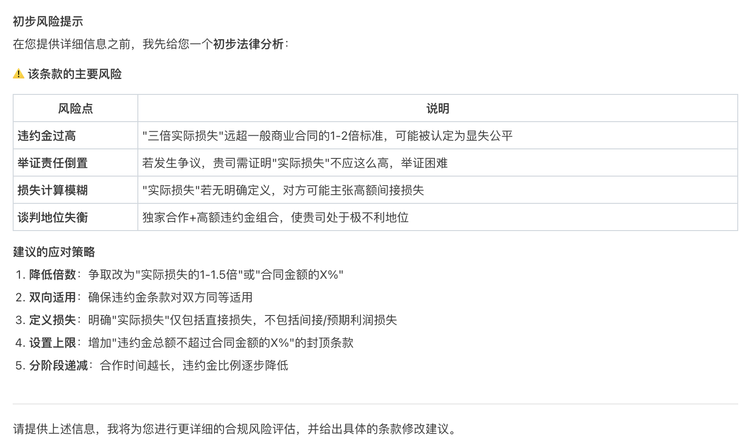 初步分析里有一个普通回答完全没有的判断:「独家合作+高额违约金组合,使贵司处于极不利地位」这是把两个条款联动起来看,是谈判结构分析,不是单纯的条款解读。
