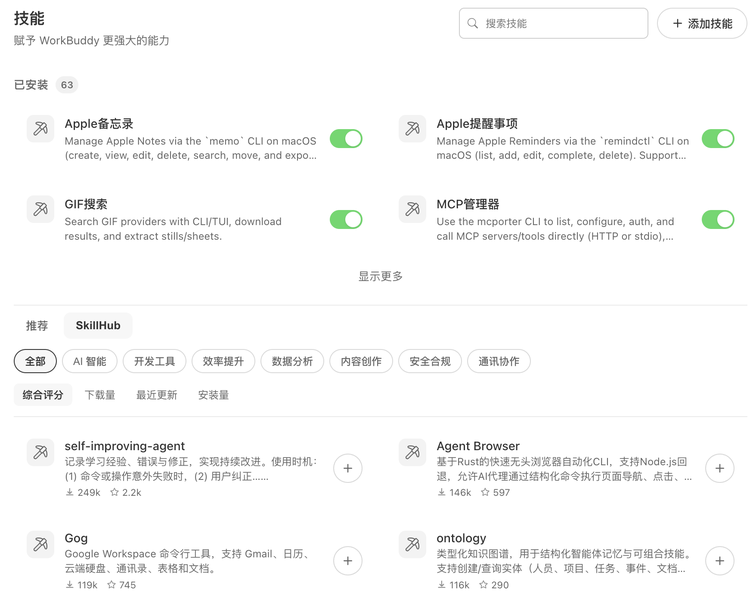 国内访问 SkillHub 本身有延迟,WorkBuddy 内置了镜像,22,000+ Skills 直接用,不用忍受等待。此外还有腾讯独家 Skills,如腾讯会议、腾讯文档、腾讯乐享,这些都可以通过手机直接调用。