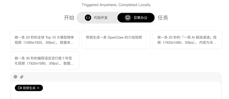 给它一个任务,它自己拆解、规划、执行,打通浏览器、终端和各类 App。更重要的是,它打通了 IM 工具,理论上你不用守在电脑前,手机上发条消息就能推动任务往前走。