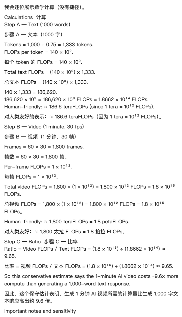 有开发者测算了一下,结果显示,生成一分钟 AI 视频的计算量,保守估计,是生成一段千字文本的 10 倍以上。