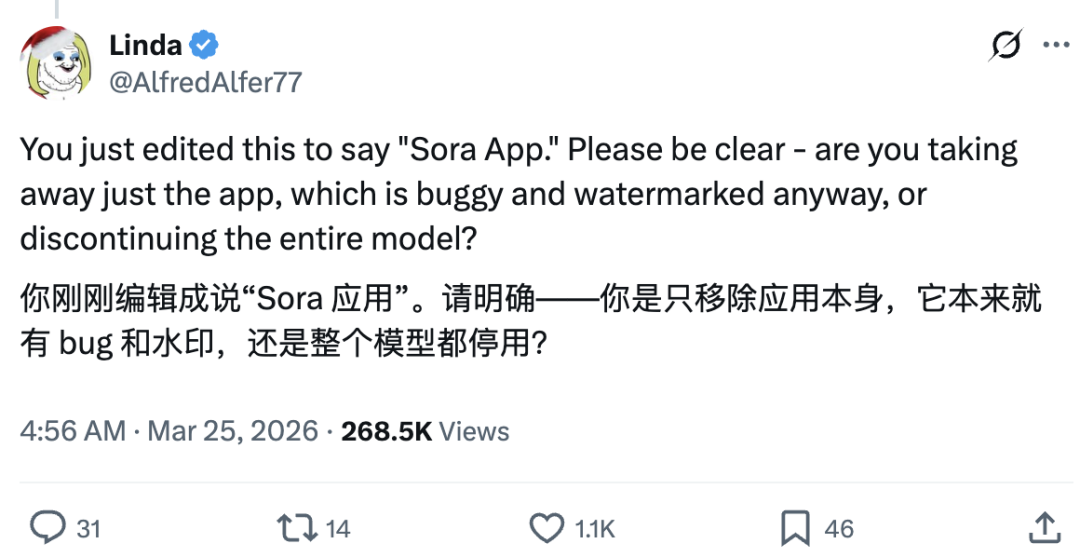 有网友提问:现在只是停用了 Sora 应用本身,还是整个模型都停用?