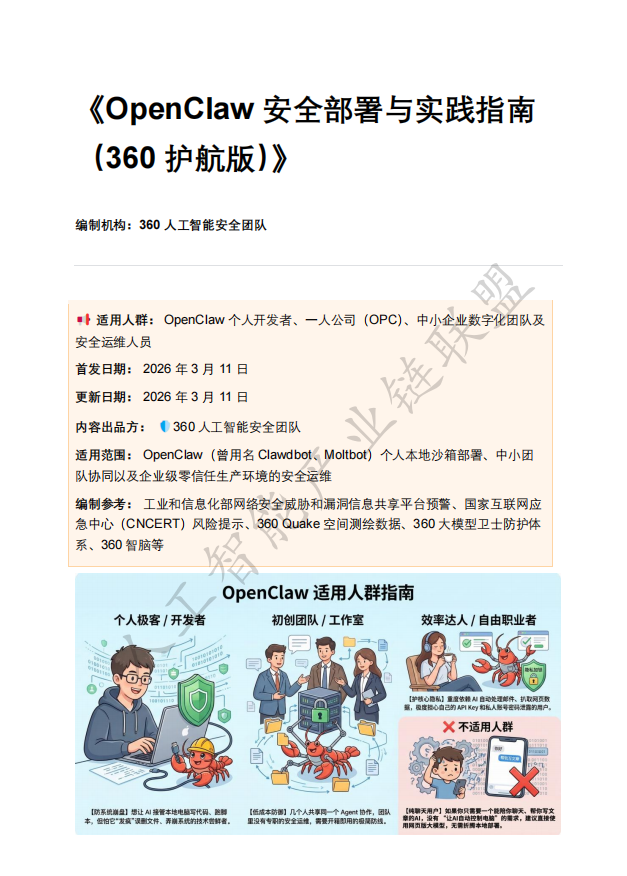360人工智能安全团队第一时间推出《OpenClaw安全部署与实践指南(360护航版)》,本文为你详细拆解这份指南的核心内容,带你从零打造一个“攻不破”的AI智能体。