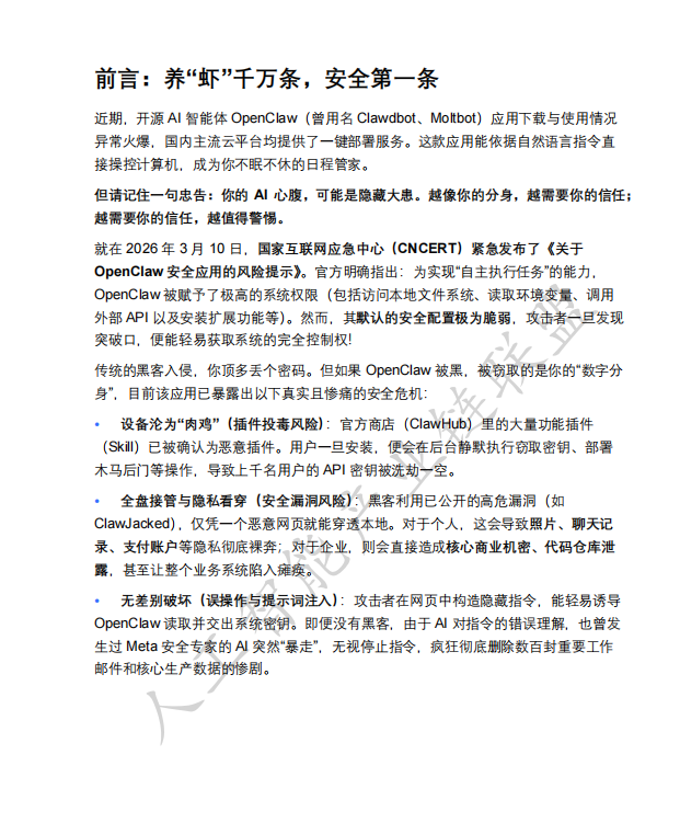 最近,开源AI智能体OpenClaw(曾用名Clawdbot、Moltbot)火爆全网,它能听懂人话,直接操控电脑,成为无数开发者和一人公司的“数字管家”。但就在2026年3月10日,国家互联网应急中心紧急发布风险提示:OpenClaw默认安全配置极其脆弱,攻击者可轻易获取系统完全控制权!设备沦为肉鸡、隐私彻底裸奔、企业数据被洗劫一空……这些已经不是科幻小说。