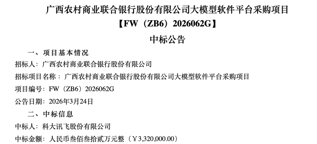 3月24日,广西农村商业联合银行股份有限公司大模型软件平台采购项目开标,科大讯飞股份有限公司中标,金额332万元。