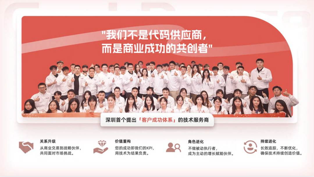 极客跳动秉持“客户成功体系”理念,是深圳首个提出该体系的技术服务商。公司坚持“我们不是代码供应商,而是商业成功的共创者”的发展定位,持续推动企业数字化转型与软件定制创新。