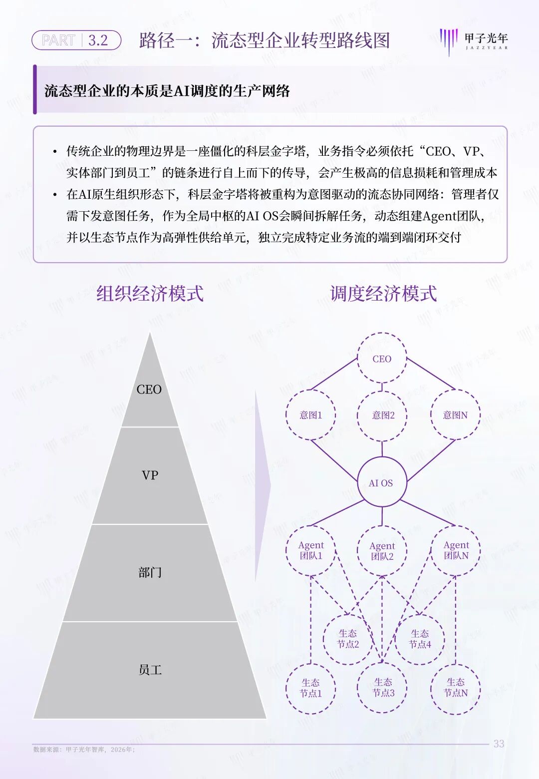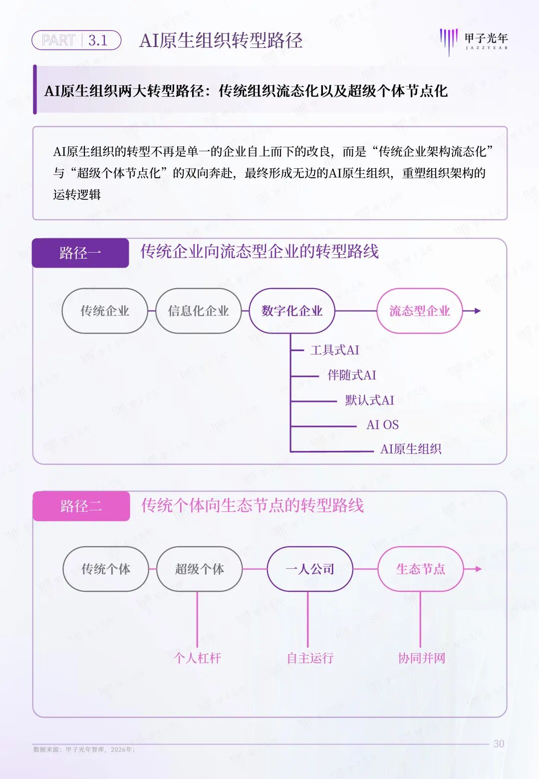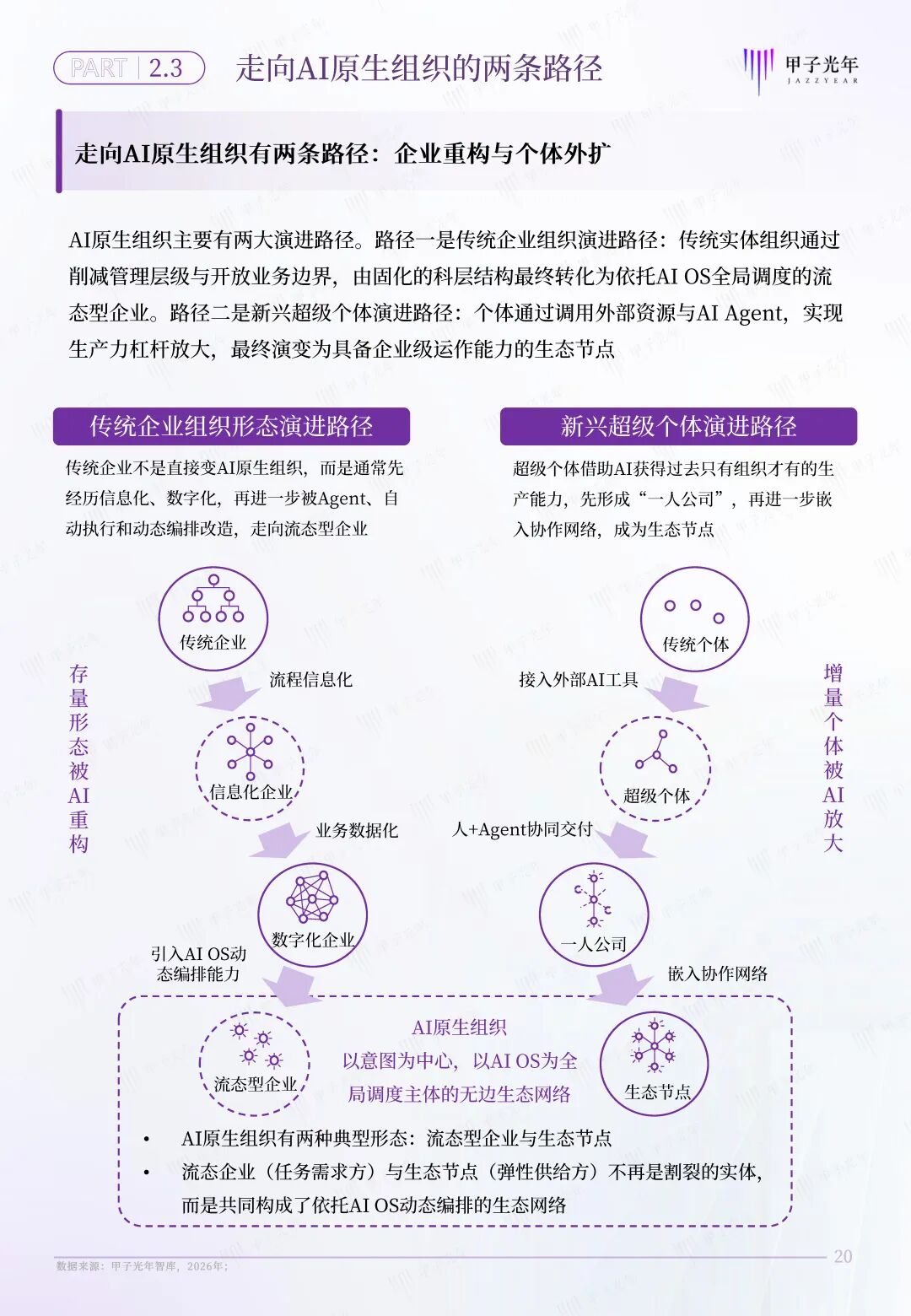 甲子智库希望通过定义AI原生组织,为传统企业和个体转型提供一套完整的转型路线图。为此,本报告特意针对AI原生组织的两条转型路径展开分析,为传统企业向流态型企业,传统个体向生态节点的转型提供参考。