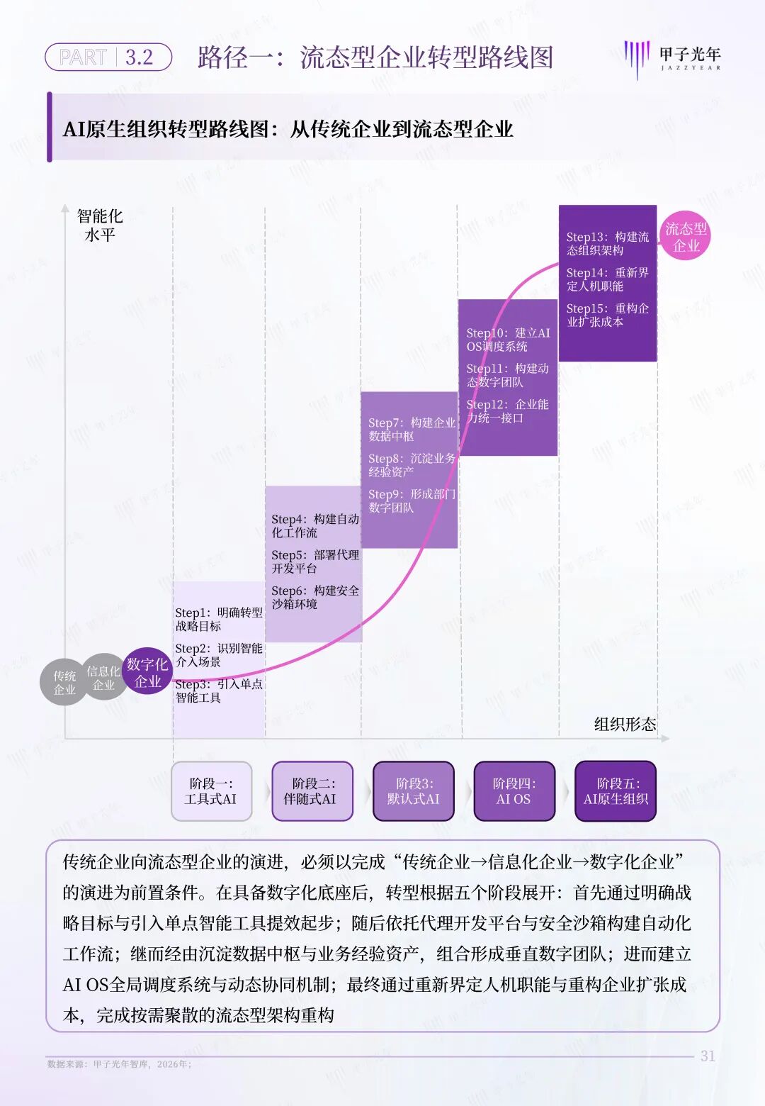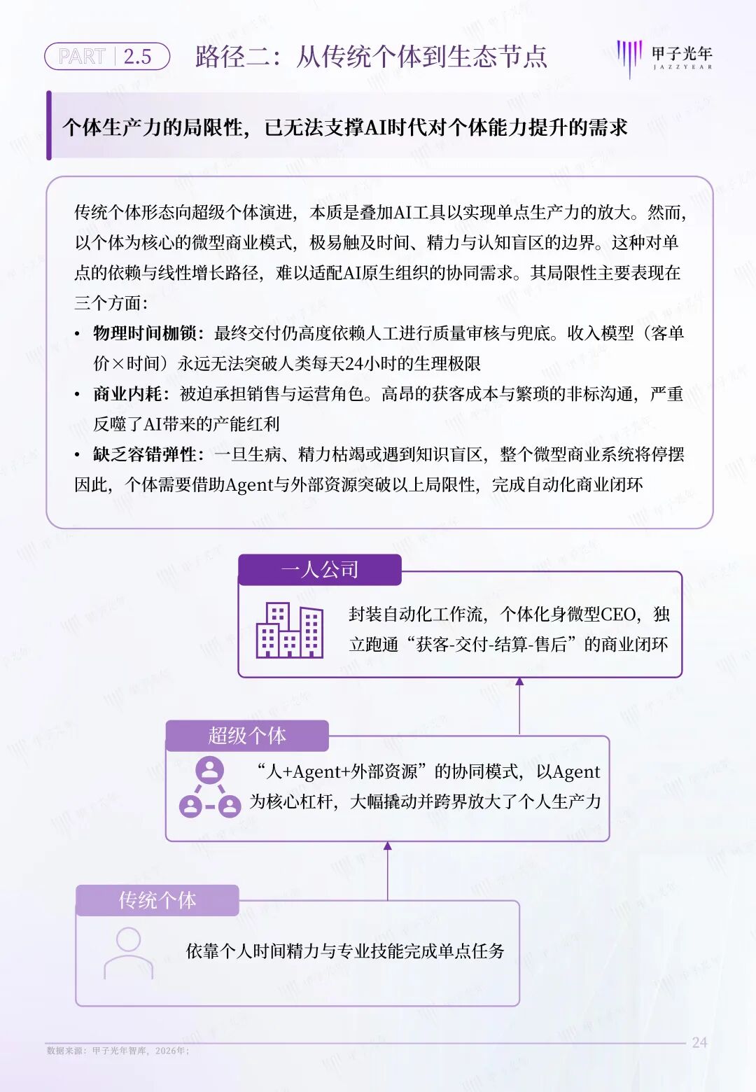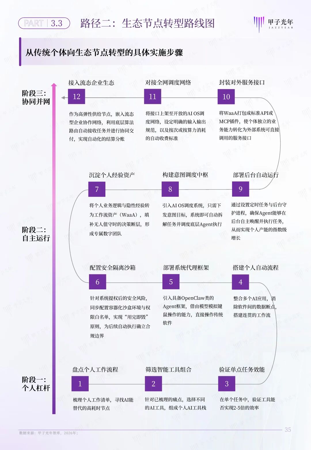 甲子智库希望通过定义AI原生组织,为传统企业和个体转型提供一套完整的转型路线图。为此,本报告特意针对AI原生组织的两条转型路径展开分析,为传统企业向流态型企业,传统个体向生态节点的转型提供参考。
