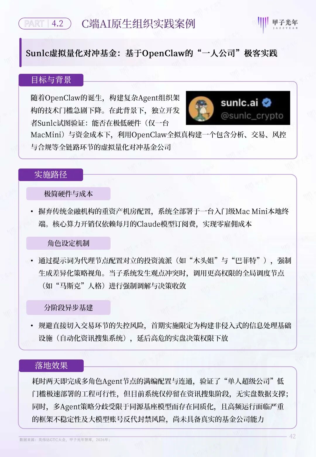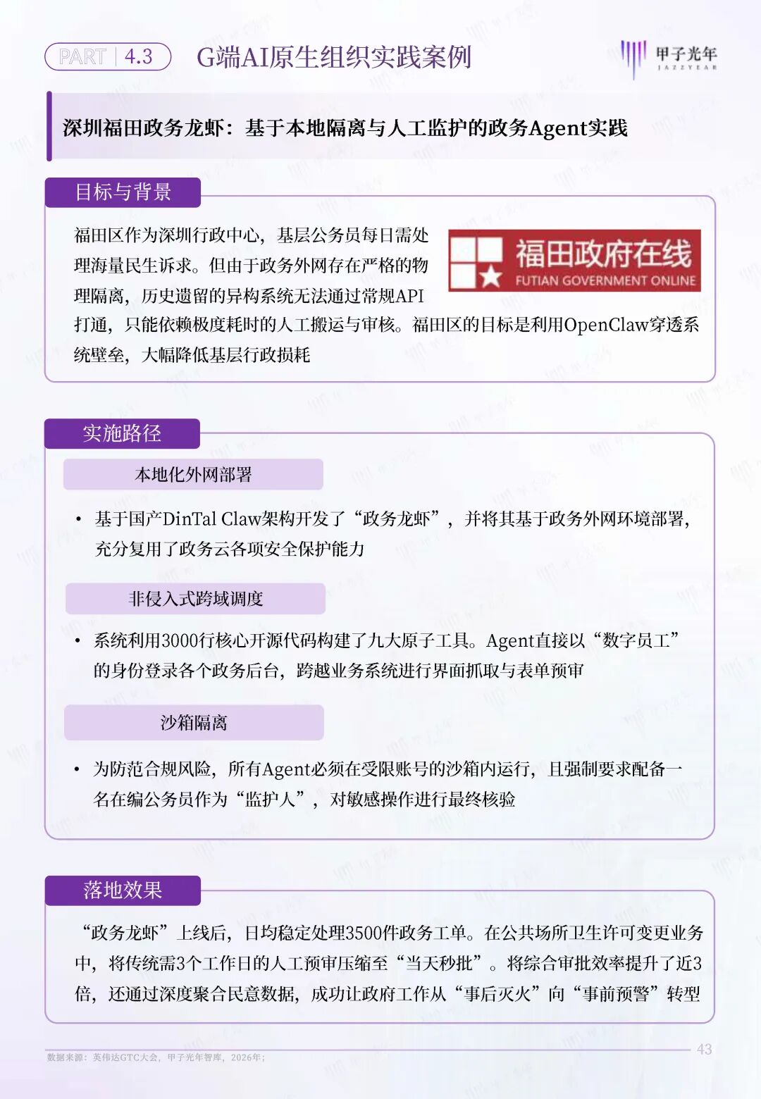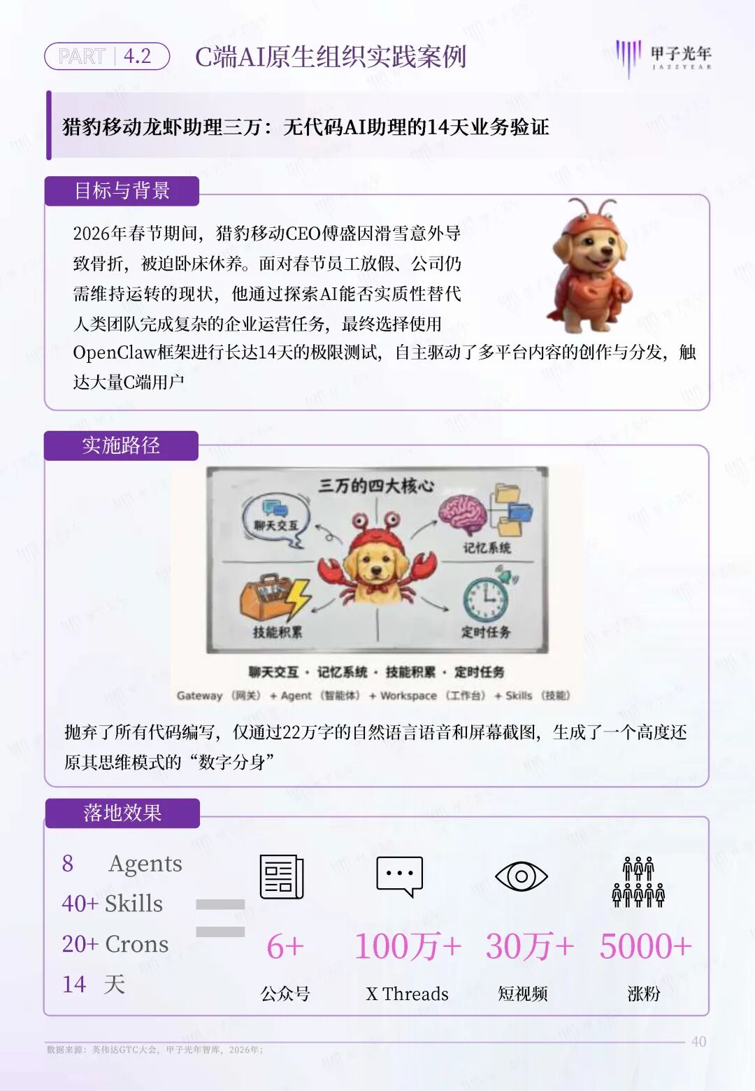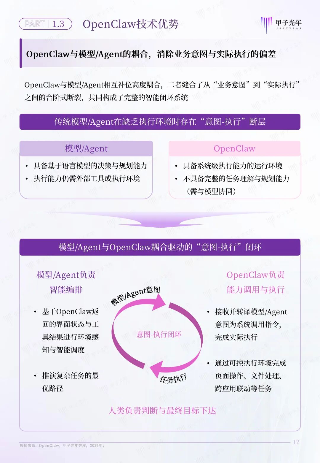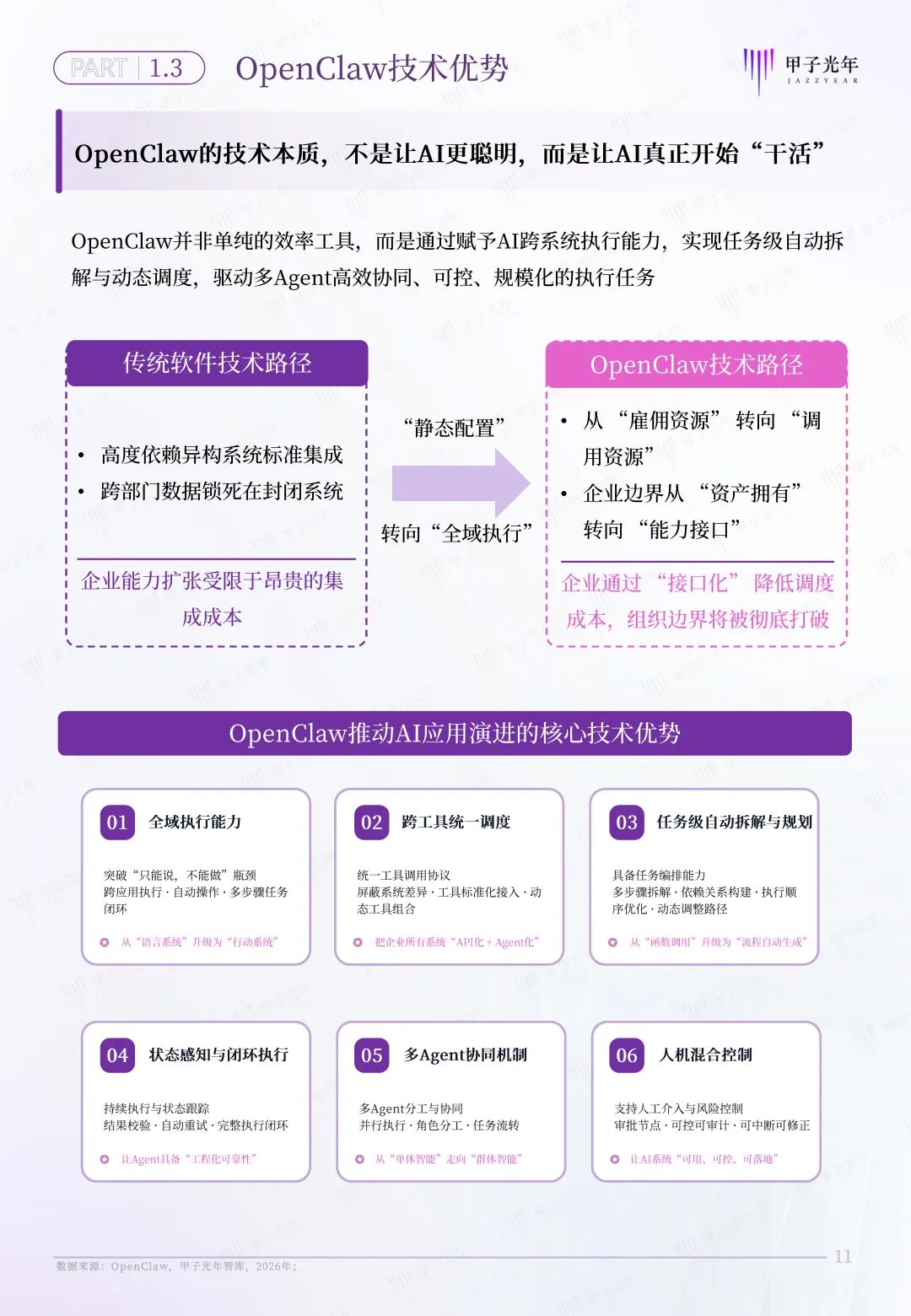 OpenClaw的意义不在于“AI能力增强”,而在于将AI从“认知工具”推进为“执行主体”,从而引发组织形态的范式跃迁:组织的核心不再是“人如何协同”,而是“AI如何被调度”。传统组织在决策、协同与执行层面将会产生颠覆性重塑,需要探索新型组织形态,以满足组织日益增长的智能化变革需求。