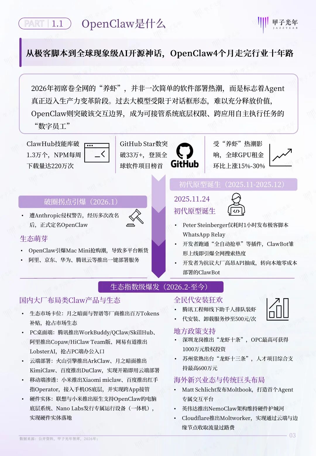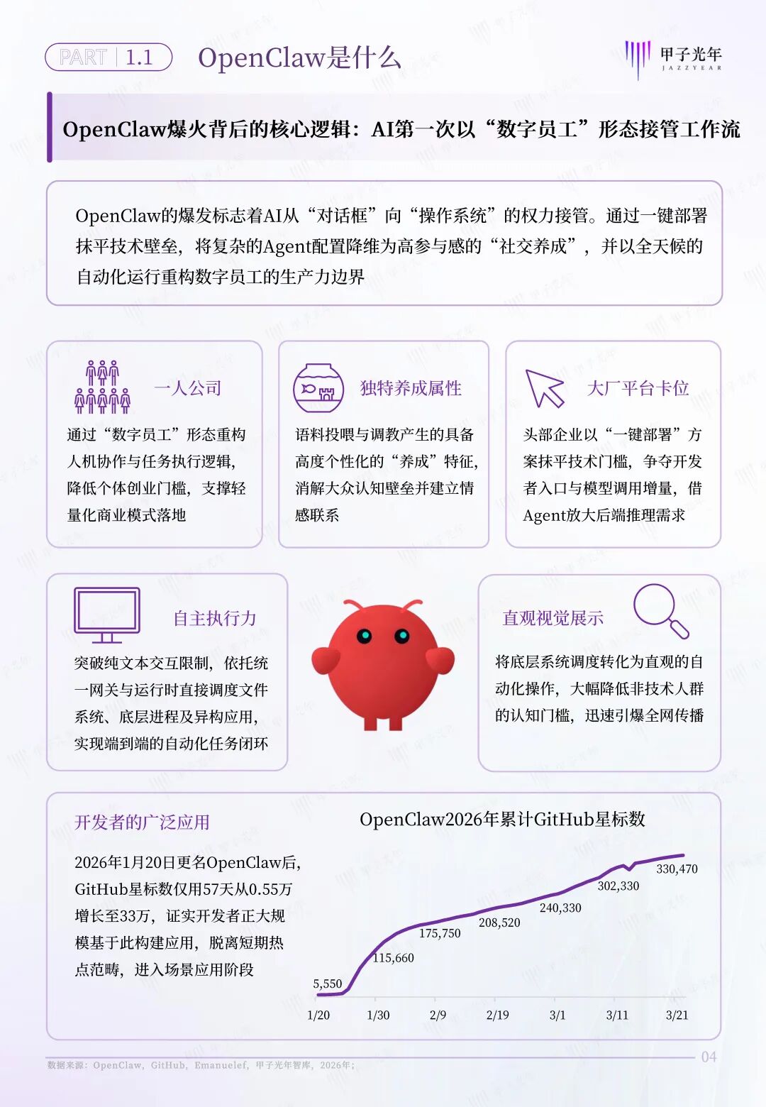 人工智能经过七十年的发展,已经从生成式AI迈入代理式AI阶段。OpenClaw从初代原型诞生开始,迅速演变成席卷全网的“养虾”热潮,这正是代理式AI真正迈入生产力变革阶段的现实写照。过去大模型受限于对话框交互形态,难以充分释放价值,OpenClaw则突破交互边界,让AI第一次以“数字员工”形态接管工作流,实现跨应用自主执行任务。