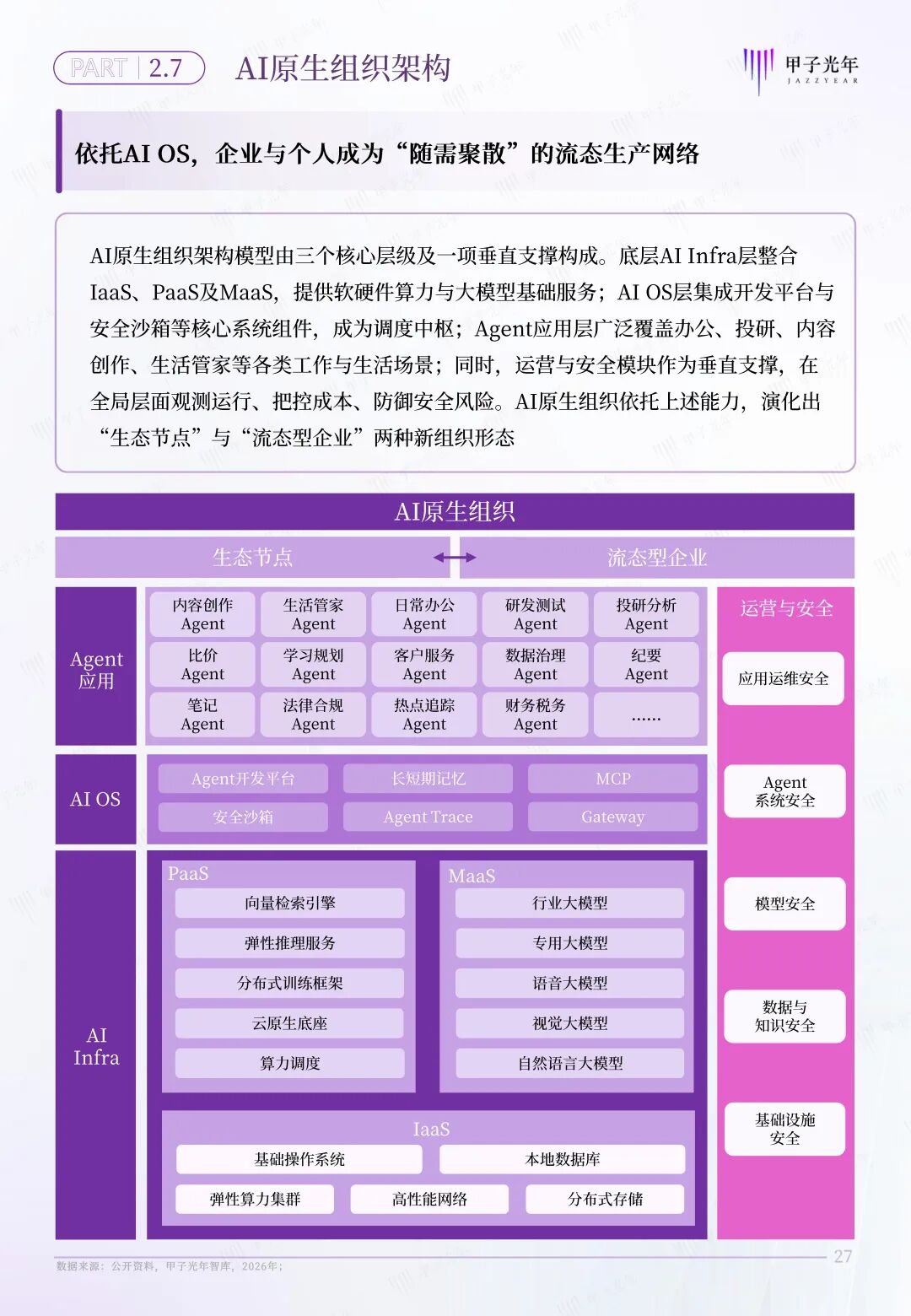 AI原生组织,是以AI OS为调度中枢、以Agent为执行单元、以动态协同网络为运行机制的新型组织形态 。其典型形态既包括由传统企业演进而来的流态型企业,也包括由传统个体演进而来的生态节点。