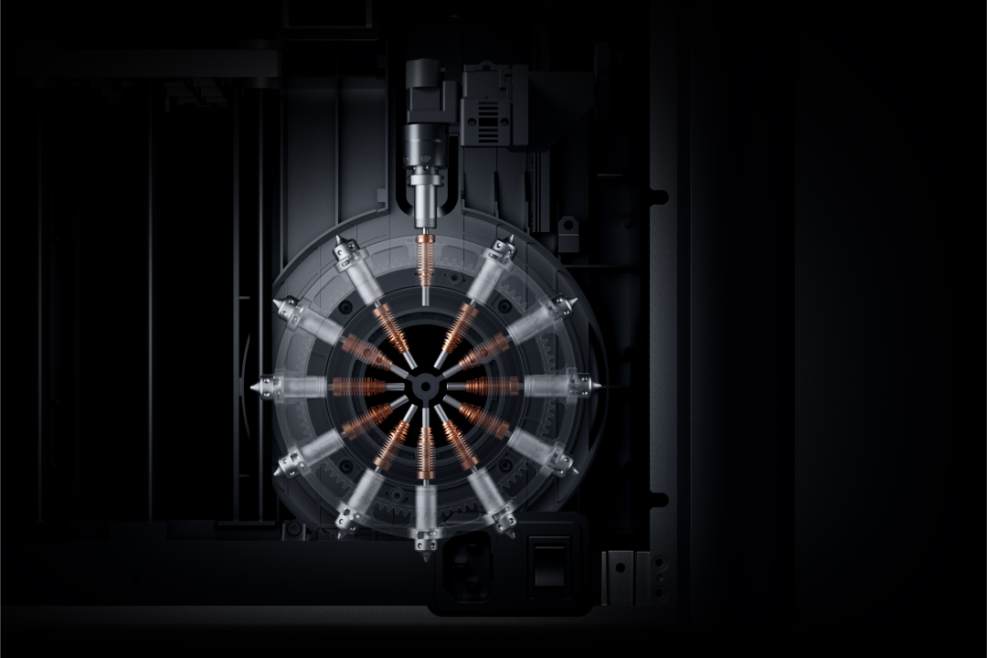 传统方案如同使用一支需要不断清洗笔尖的钢笔来创作一幅油画。而原子重塑给出的答案是 OmniElement™智能喷嘴切换系统,一个精巧的、如同左轮手枪弹巢般的转盘机构。它在共用一个热端的前提下,集成了 12 个独立喷嘴,可快速旋转切换。