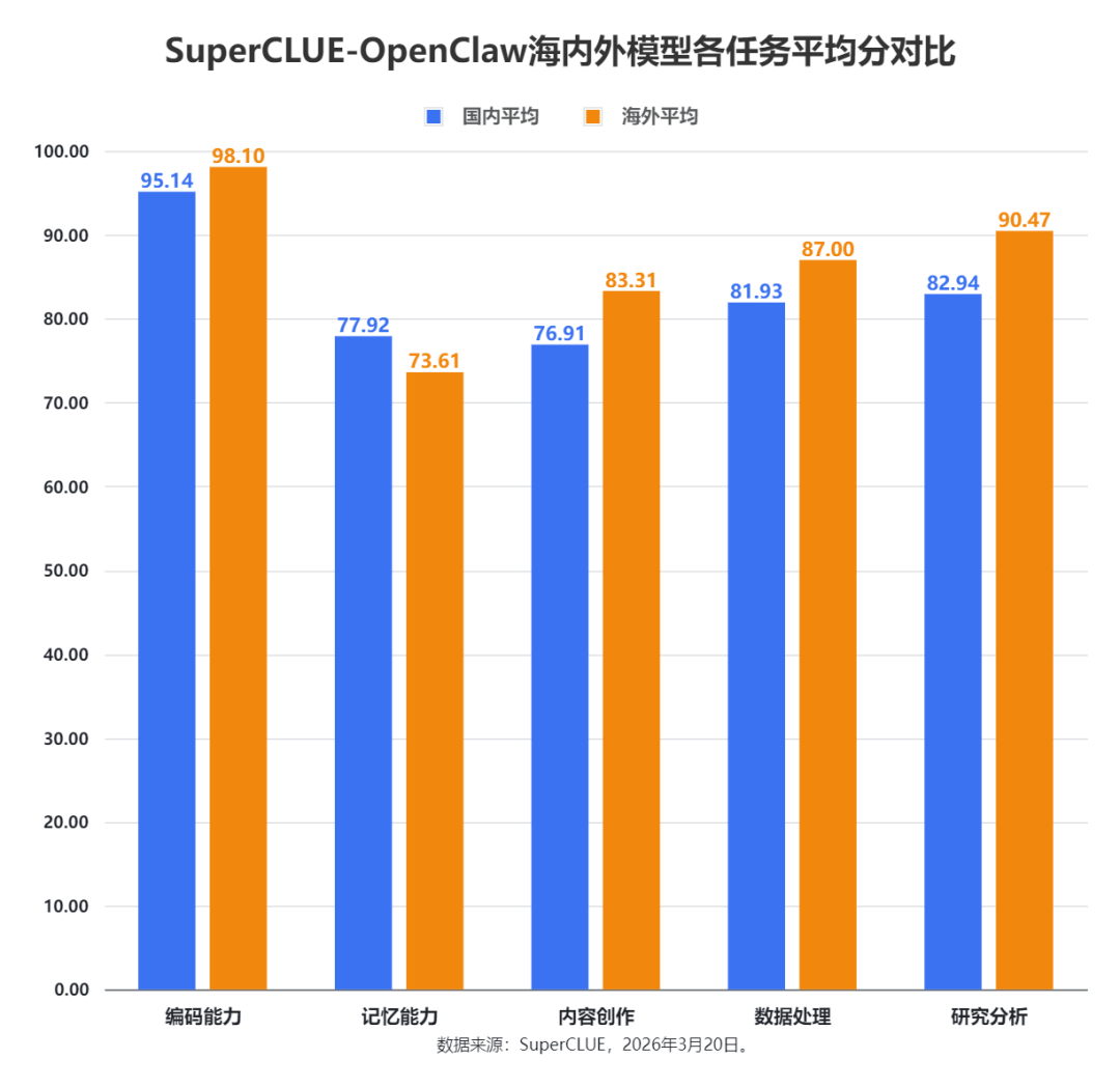 海外模型在综合任务能力上略占上风,在四大维度中均有领先,国内模型在编码领域已形成竞争力,记忆能力更是唯一反超的维度。