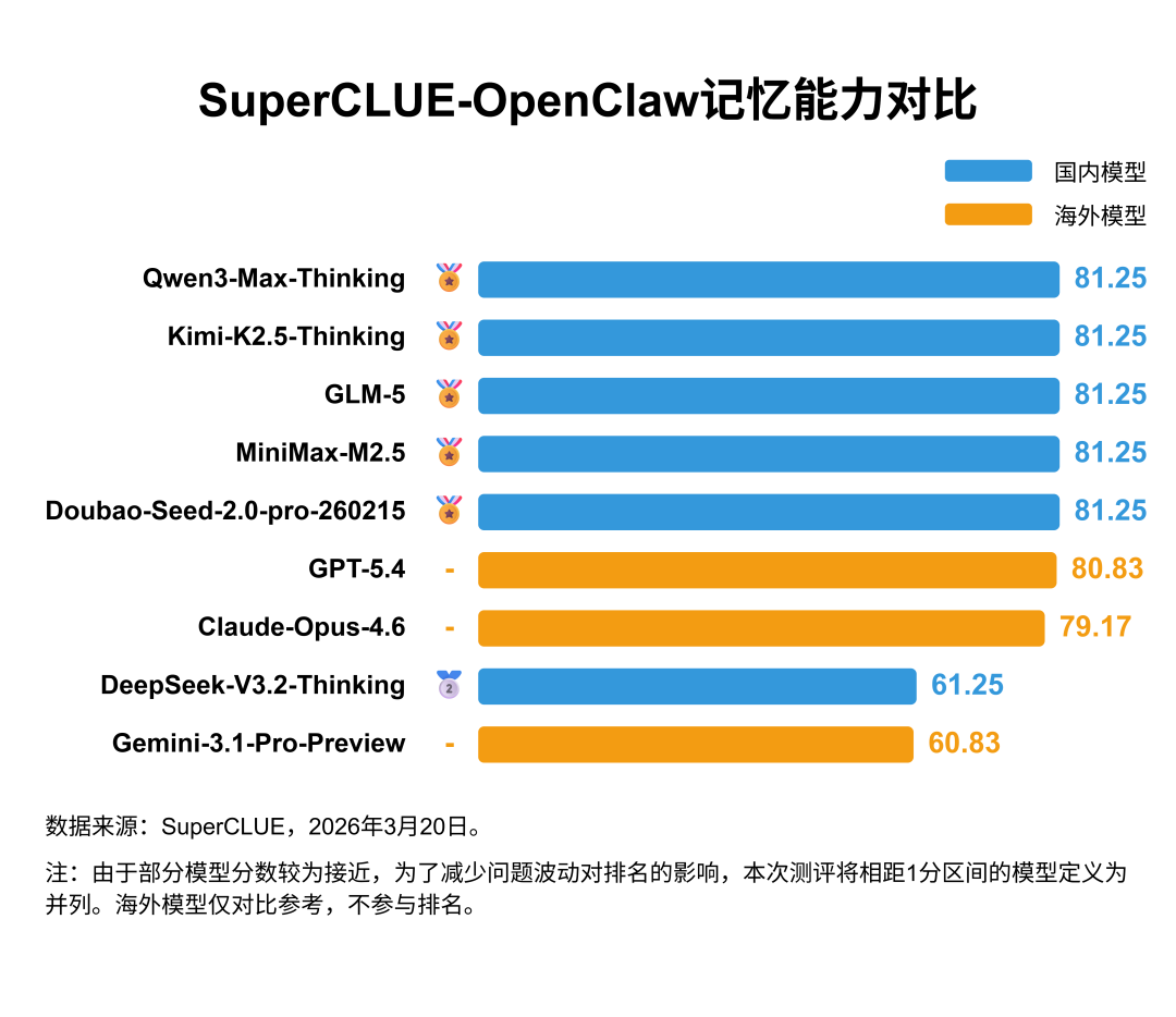 (1)国内模型记忆能力全面登顶。国产头部模型Qwen3-Max-Thinking、Kimi-K2.5-Thinking、GLM-5、MiniMax-M2.5、Doubao-Seed-2.0-pro均获得81.25分,在OpenClaw记忆能力评测中形成"第一梯队"并列领先,整体略胜海外主流模型。