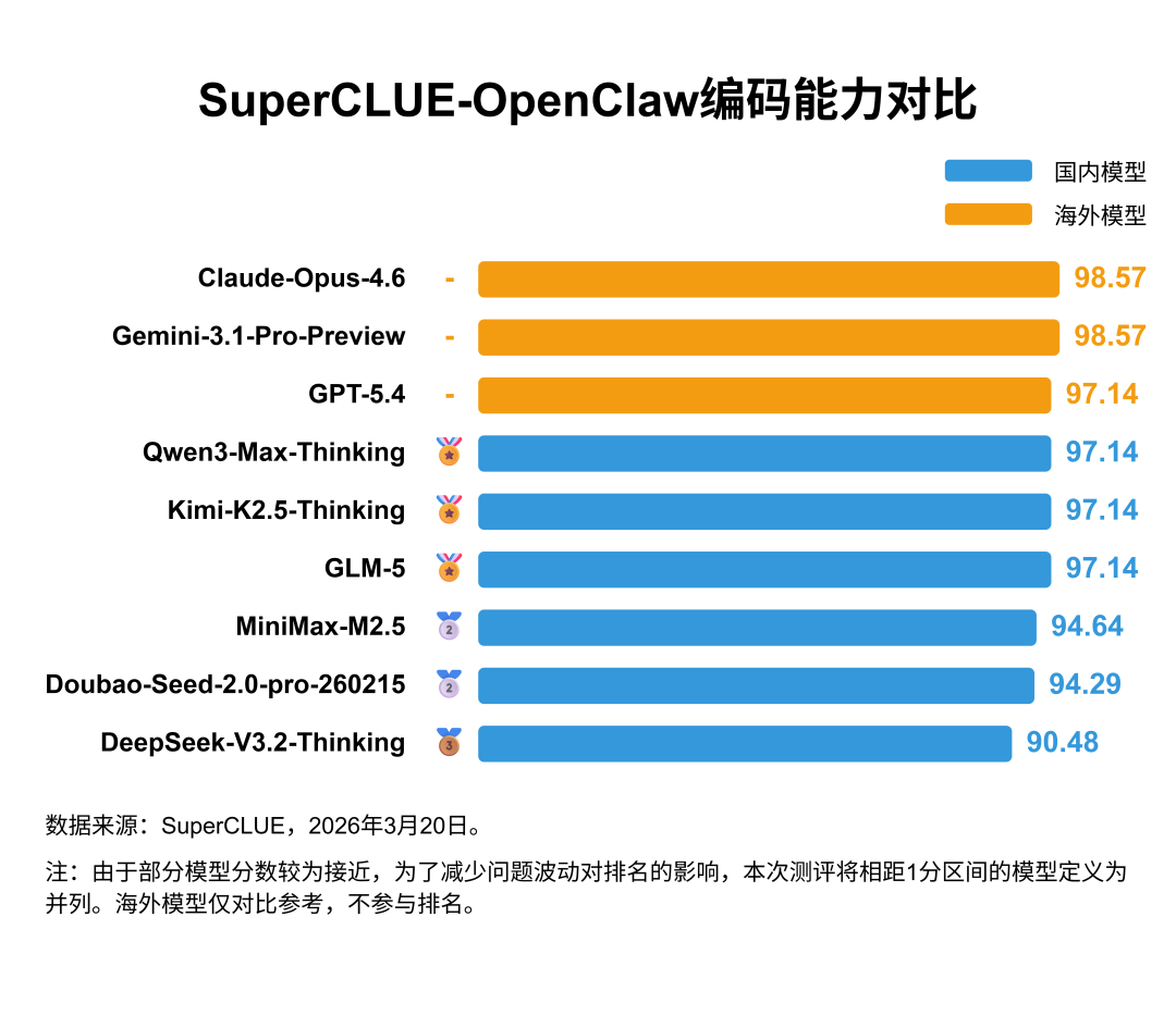 海内外模型均表现优异(95.14 vs 98.10),差距仅2.96分,说明国内模型在代码生成/理解场景已接近国际顶尖水平。