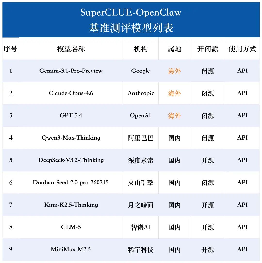 本次 SuperCLUE-OpenClaw 测评基准共测评了9个模型,包括6个国内模型,3个海外模型,以下是具体的测评模型列表: