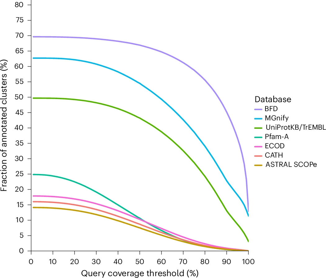 更重要的发现来自聚类结果本身。研究显示,大规模聚类后可以识别出大量此前未被数据库覆盖的蛋白家族。例如,在与现有数据库对比中,约有 1.18 亿个蛋白簇无法映射到已有资源,提示存在大量「未知蛋白空间」。