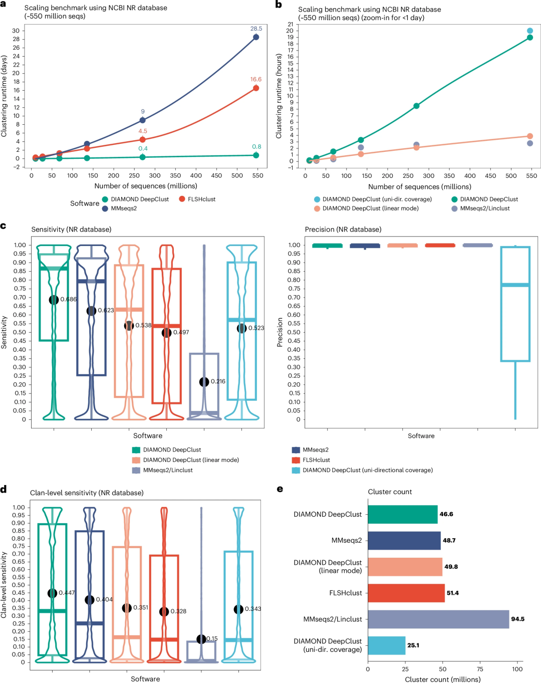 图1:DIAMOND DeepClust、MMseqs2 和 FLSHclust 聚类性能的基准测试。