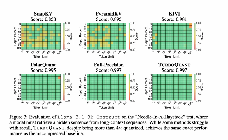 论文中做了一个测试"大模型在超长文章里找一句话的能力"。颜色越绿越好。TurboQuant 压缩了 4 倍,颜色和不压缩完全一样。
