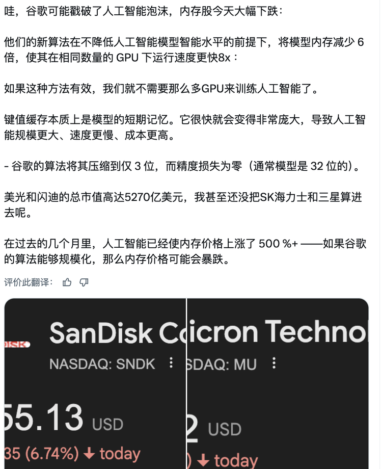 这次内存股暴跌显然又是一个乌龙,市场对一篇范围有限的算法论文,经过一番诡异的折腾,最终做出了一个关于整个产业周期的判断,并直接真金白银冲击了二级市场。