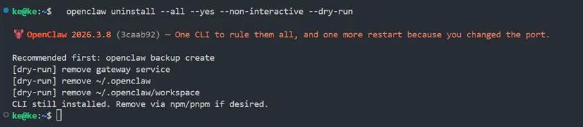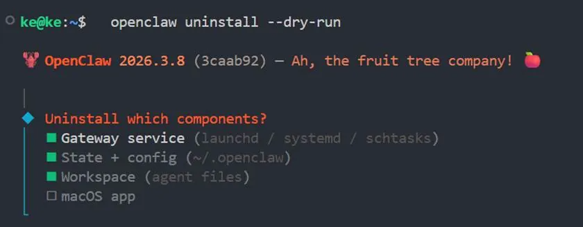 可以先执行 openclaw uninstall --dry-run,在 2026.3.8 这个版本里会先进入交互式选择界面,让你勾选要卸哪些内容: