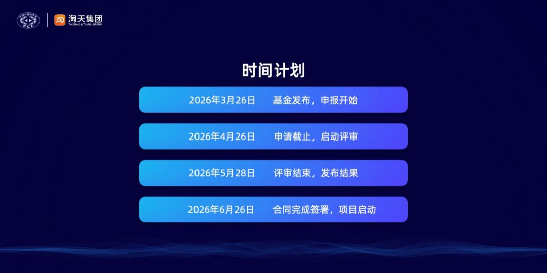 基金课题支持金额为人民币30万元/项,项目合作周期一年。项目期间,为确保学生能够接触到真实的工业和应用场景,淘天集团将提供学生实习的机会。